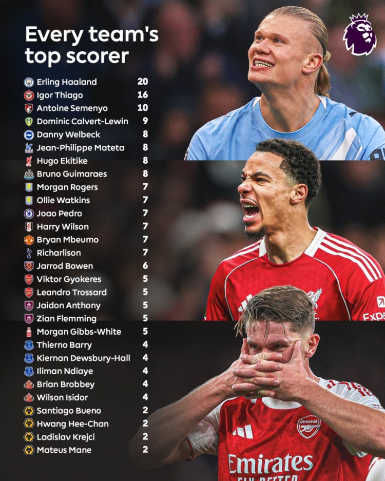 1月24日讯 英超官方列本赛季各队联赛射手王,曼城哈兰德、切尔西若昂·佩德罗、曼联姆伯莫、阿森纳约克雷斯+特罗萨德、利物浦埃基蒂克、热刺里沙利松。